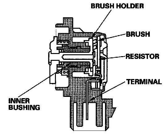 Throttle Position (TP) SensorThe TP sensor is a potentiometer connected to the throttle valve shaft. As the throttle position changes, the sensor varies the signal voltage to the ECM. The TP sensor is not replaceable apart from the throttle body.