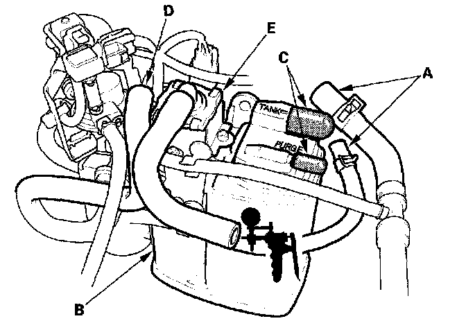 5. Disconnect the vacuum hose (D) from the EVAP canister vent shut valve (E), and connect a vacuum pump/gauge, 0 - 30 in.Hg, to the vacuum hose.