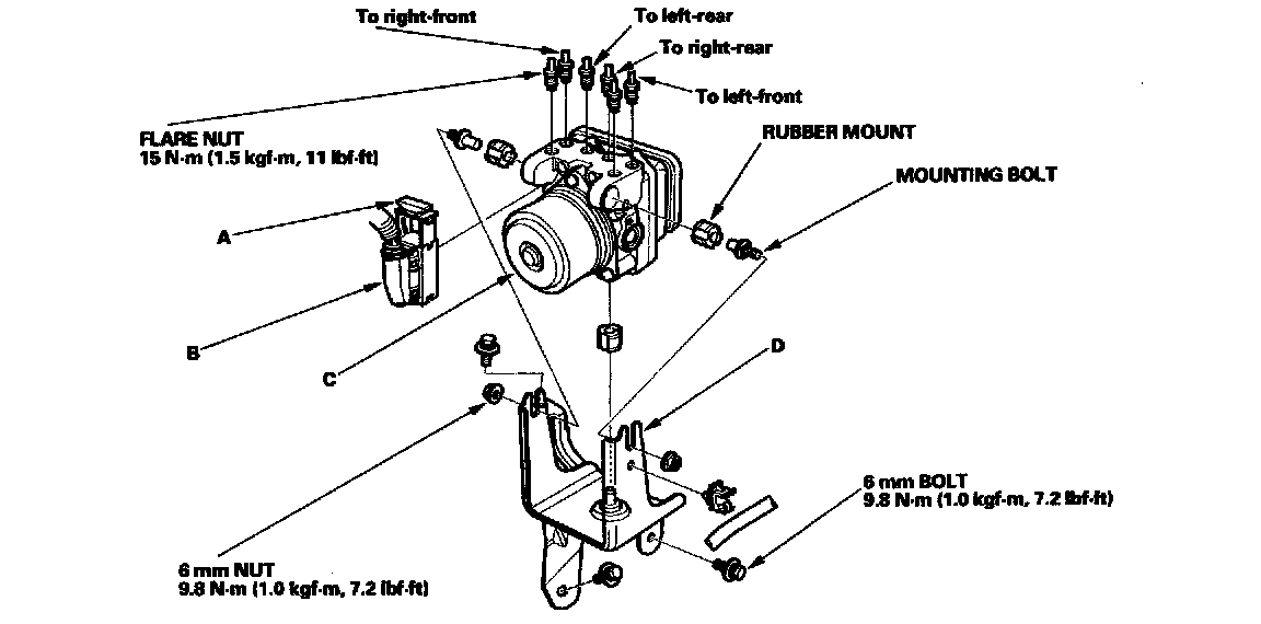 4. Remove the ABS modulator-control unit (C) from the bracket (D).