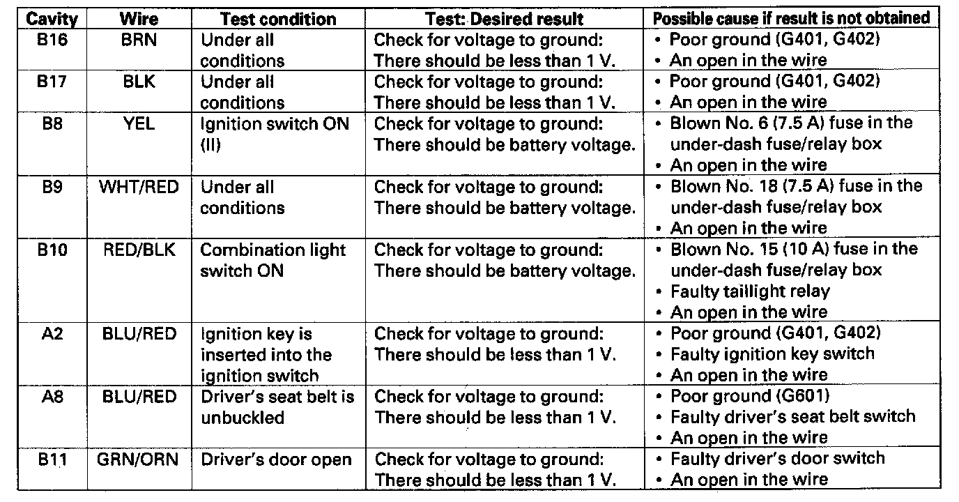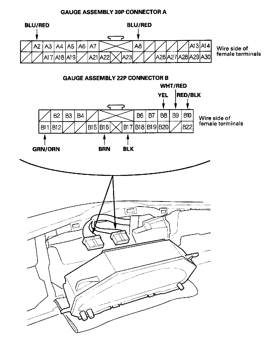 4. Connect the connectors to the gauge assembly and make these input tests at the connector.
