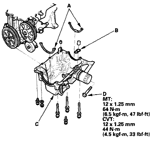 , then install the oil pan (C). Tighten the transmission housing mounting bolts (D).