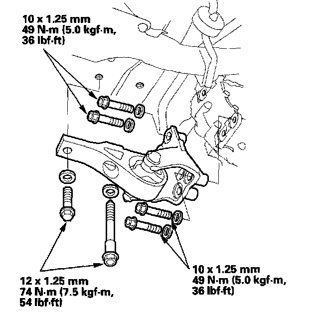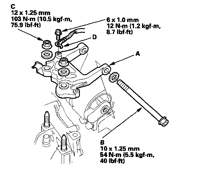 10. Install the transmission mount bracket (A). Tighten the bolt (B) loosely, and tighten the nuts (C) to the specified torque, then tighten the bolt to the specified torque.
