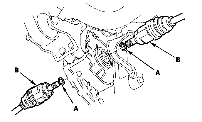 NOTE: Clean the areas where the driveshafts contact the transmission (differential) with solvent or carburetor cleaner, and dry with compressed air. Turn the right and left steering knuckle fully outward, and slide the driveshafts into the differential until you feel its set ring engages the side gear.
