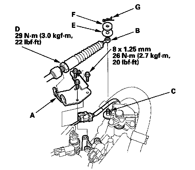 25. Install the shift cable end (B) on the control lever (C). Install the shift cable on its bracket, and tighten the locknut (D). Do not bend the shift cable excessively.