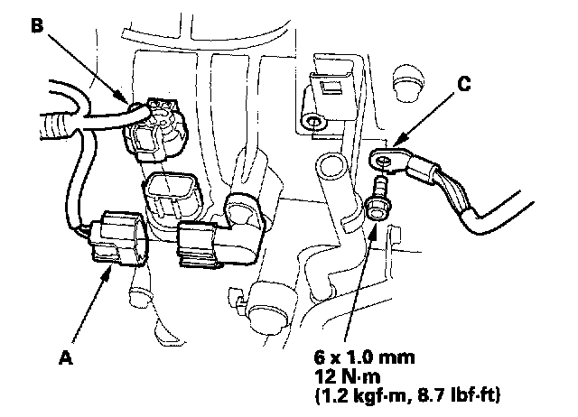 22. Connect the CVT output shaft (driven pulley) speed sensor connector (A), CVT speed sensor connector (B), and vehicle speed sensor connector (C).