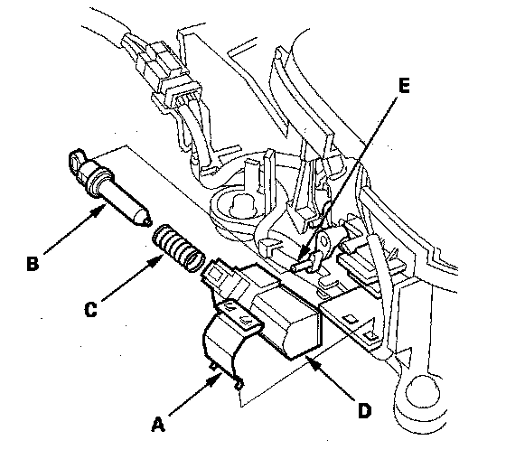 5. Install the shift lock solenoid plunger (B) and plunger spring (C) in the new shift lock solenoid (D).