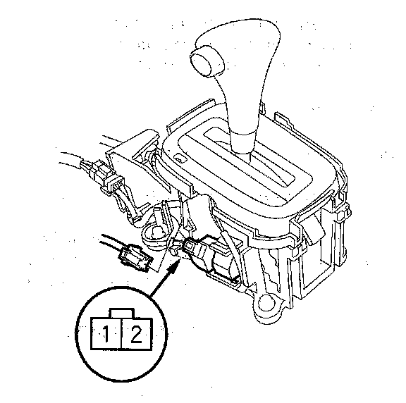 3. Connect the battery positive terminal to shift lock solenoid connector terminal No. 1, and connect the battery negative terminal to connector terminal No. 2. Do not connect the battery positive terminal to connector terminal No. 2 or you will damage the diode inside the shift lock solenoid.
