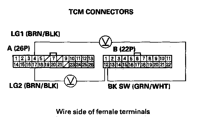 6. Press the brake pedal, and measure the voltage between TCM connector terminals B12 and A4 or A17.