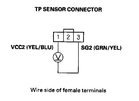 YES- Check for a short to ground in the wire between TP sensor connector terminal No. 3 and ground. If the wire is OK, replace the TP sensor.