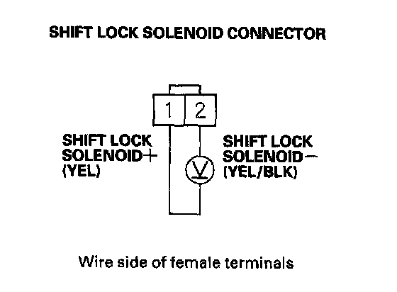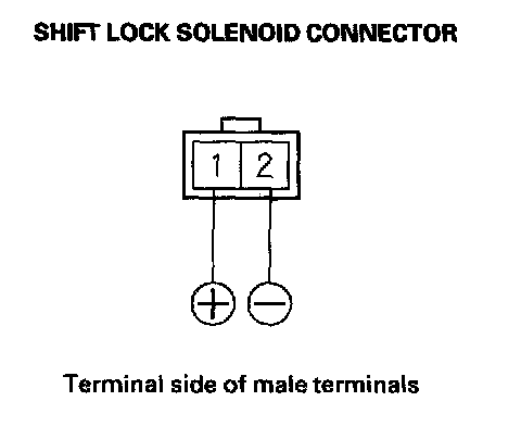 21. Connect the battery positive terminal to shift lock solenoid connector terminal No. 1, and connect the battery negative terminal to connector terminal No. 2. Do not connect the battery positive terminal to connector terminal No. 2 or you will damage the diode inside the shift lock solenoid.