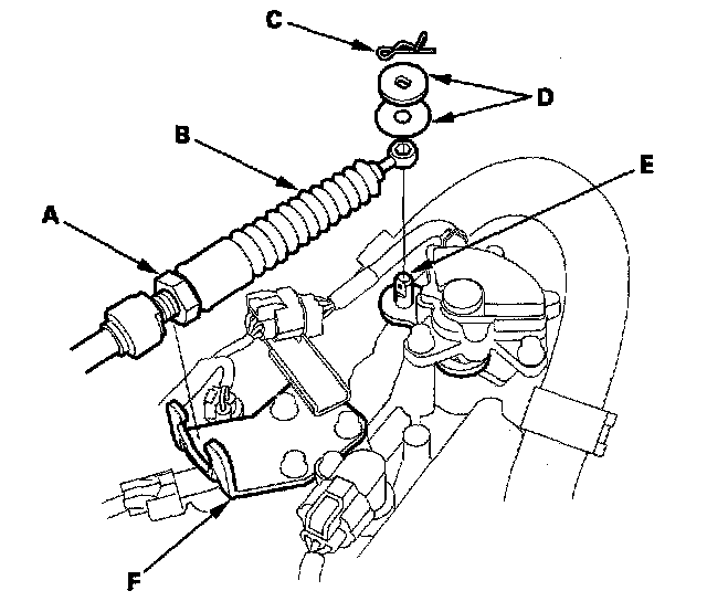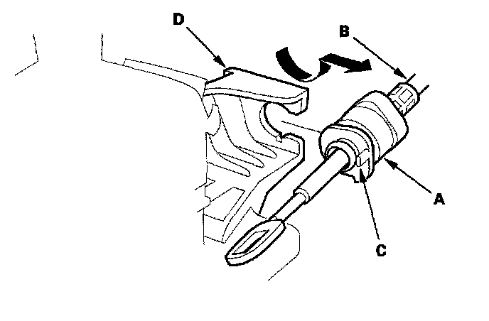 4. Rotate the socket holder (A) on the shift cable (B) a quarter turn; the projection (C) on the socket holder faces direction to remove. Then slide the holder to remove the shift cable from the shift cable bracket base (D).