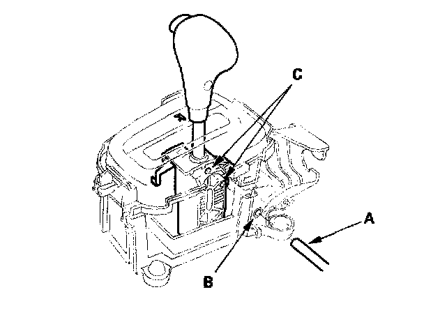 17. Insert a 6.0 mm (0.24 inch) pin (A) through the positioning hole (B) on the shift lever bracket base and into the positioning hole (C) on the shift lever. The shift lever is secured in the R position.