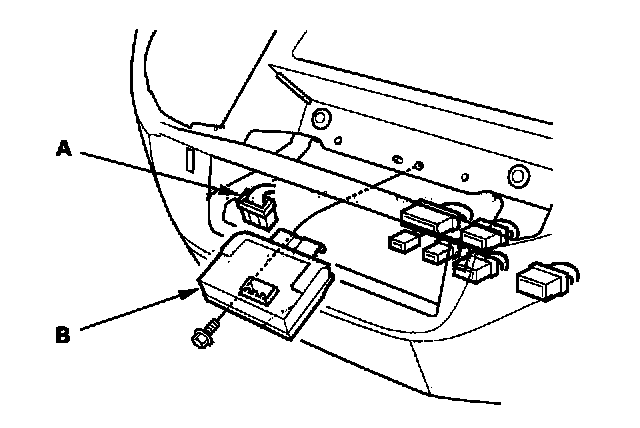 2. Disconnect the connector (A), then remove the bolts and the active noise control unit (B).