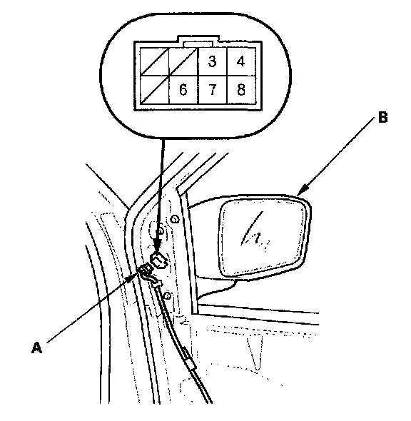 2. Disconnect the 8P connector (A) from the power mirror actuator (B).