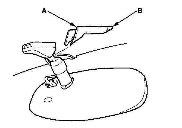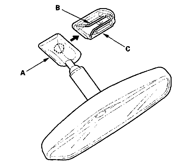 4. Slide the rearview mirror (A) down toward the bottom of the windshield to detach it from the spring (B) in the mount (C).