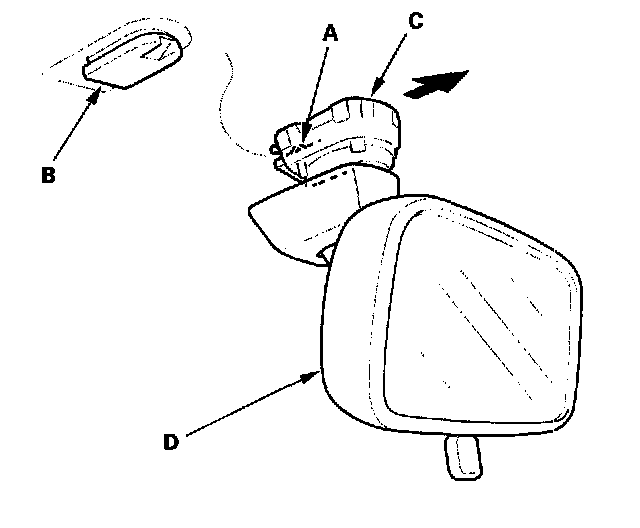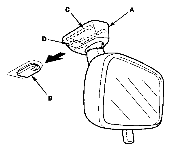 2. Pull the hook (A) down to release it from the mount (B), and the slide the mirror base (C) rearward, then remove the rearview mirror (D)