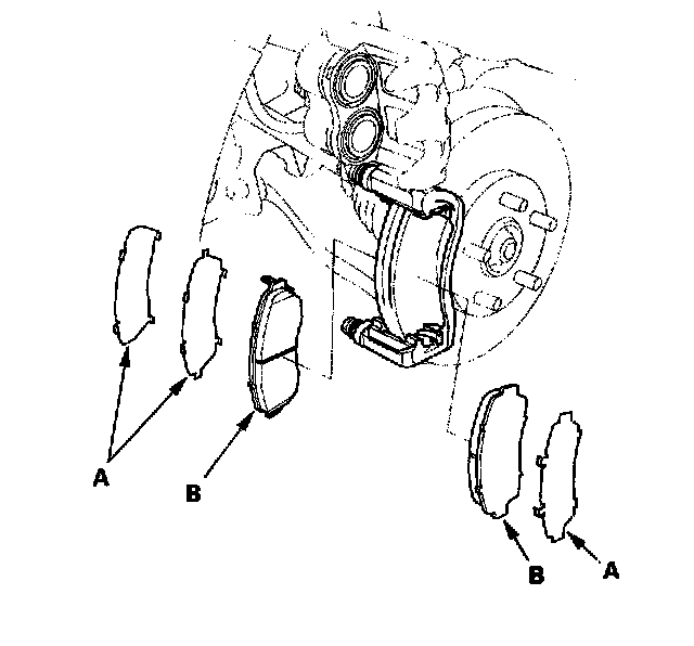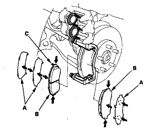 11. Install the brake pads and pad shims correctly. Install the brake pad with the wear indicator (C) on the inside. If you are reusing the brake pads, always reinstall the brake pads in their original positions to prevent a loss of braking efficiency.