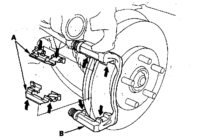 8. Apply a thin coat of M-77 assembly paste (P/N 08798-9010) to the retainers on their mating surfaces (indicated by the arrows) against the caliper bracket (B).