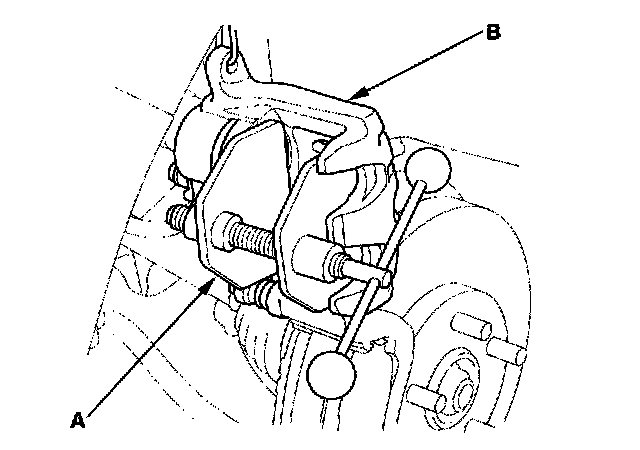 12. Mount the commercially available brake caliper wrench (A) on the caliper (B).