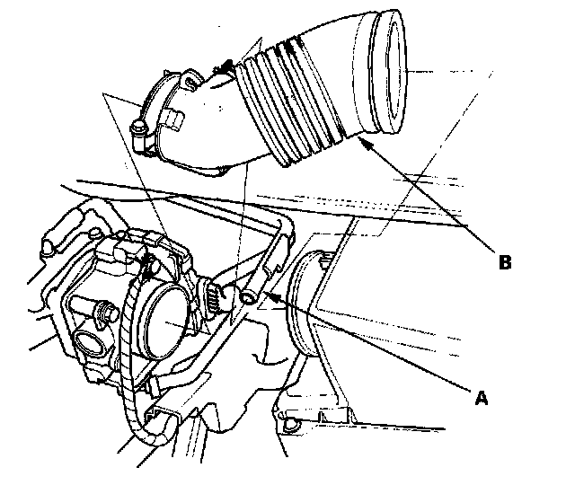 9. Remove the breather pipe (A), then remove the intake air duct (B).