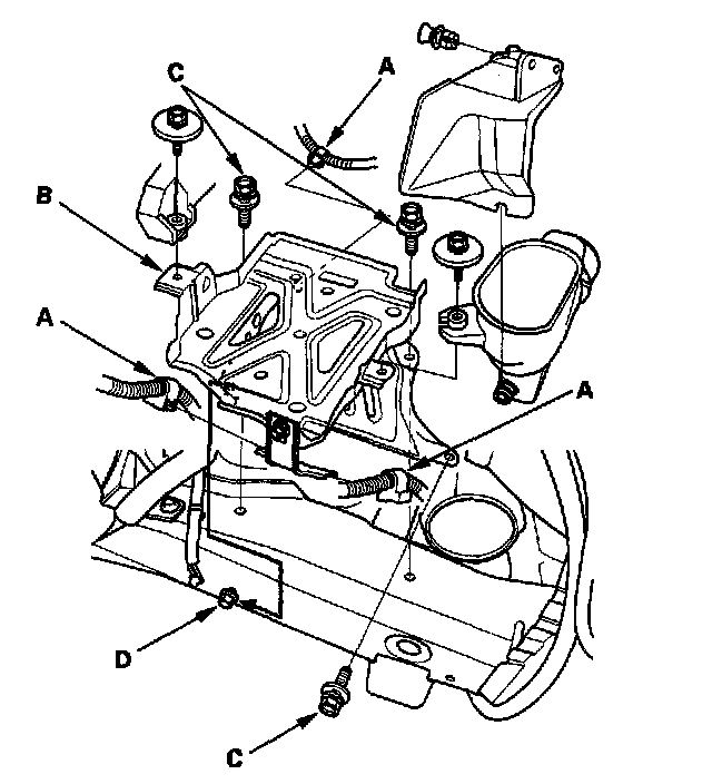 12. Remove three mounting bolts (C) and loosen the mounting bolt (D), then remove the battery base.