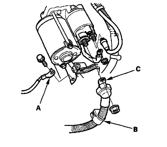 13. Remove the ground cable (A), harness clamp (B), and starter motor cable (C).