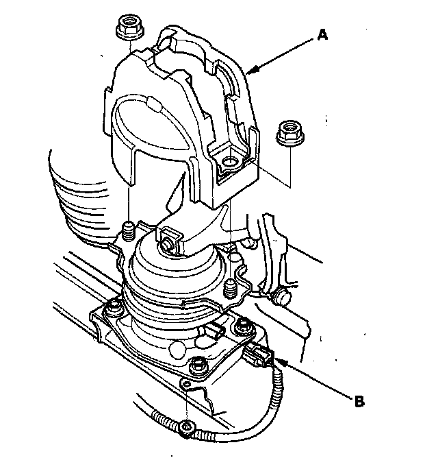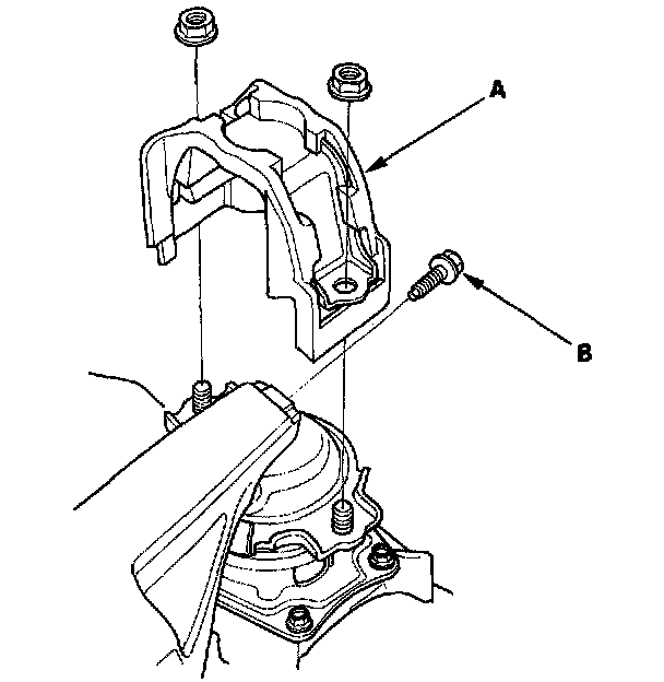 45. J35A7 engine: Remove the nuts securing the rear mount stop, then remove the rear mount stop (A), then remove the rear mount bolt (B).