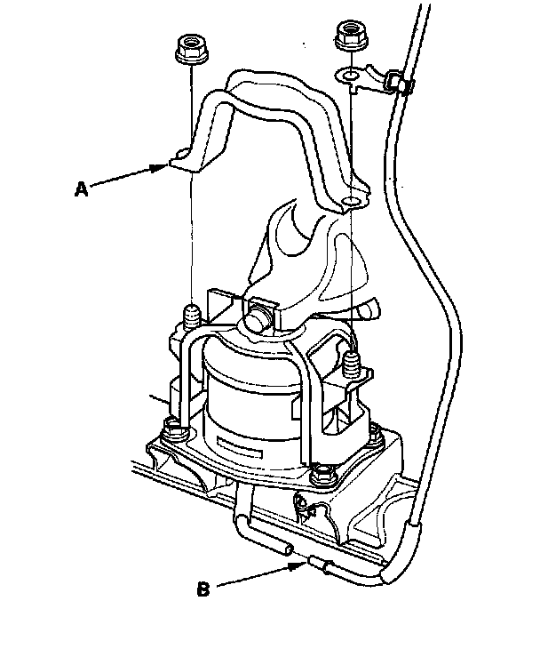 15. J35A6 engine: Remove the front mount stop (A), then disconnect the front engine mount control solenoid valve tube (B).
