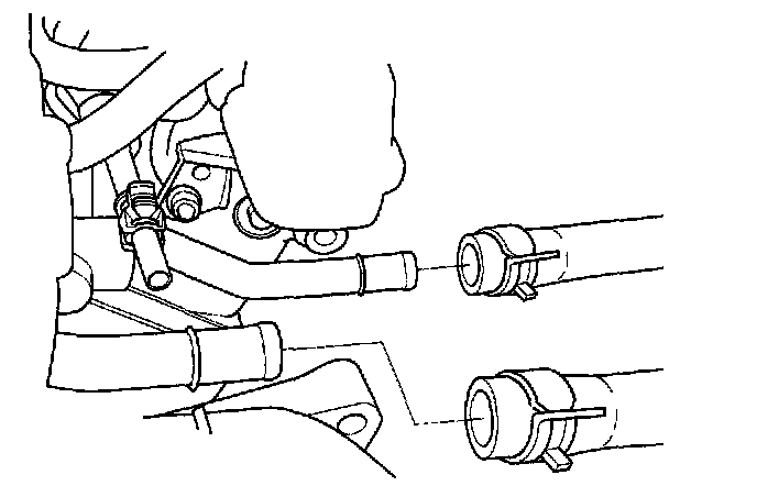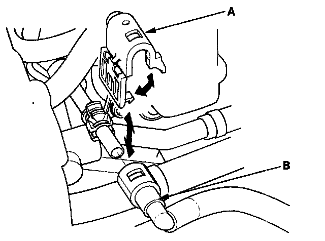 17. Remove the brake booster vacuum hose (A) and evaporative emission (EVAP) canister hose (B).