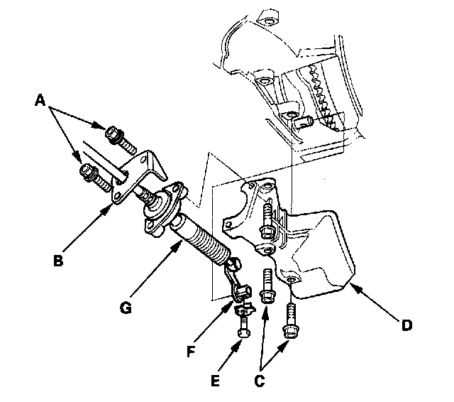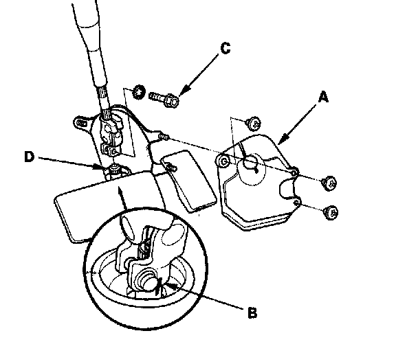 39. Remove the bolts (A) securing the shift cable holder (B). Remove the bolts (C) securing the shift cable cover, then remove the shift cable cover (D). To prevent damage to the control lever joint, be sure to remove the bolts securing the shift cable holder before removing the bolts securing the shift cable cover.
