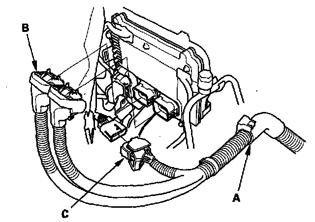 23. Remove the harness clamp (A), then disconnect engine wire harness connectors (B) and cabin wire harness connector (C) on the right side of the engine compartment.