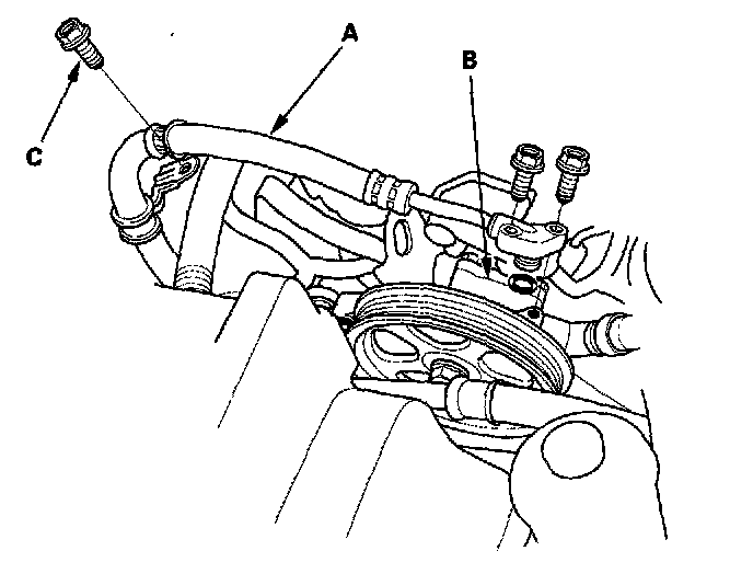 26. Remove the power steering (P/S) pump outlet hose (A) at the pump (B) and remove the hose clamp bolt (C).