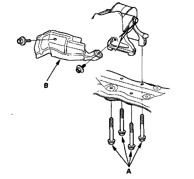 46. J35A6 engine: Remove the rear mount bolts (A), then remove the heat shield (B).