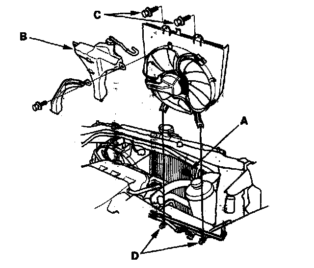 49. Remove the two bolts (C), loosen the bottom bolts (D), then remove the condenser fan shroud.