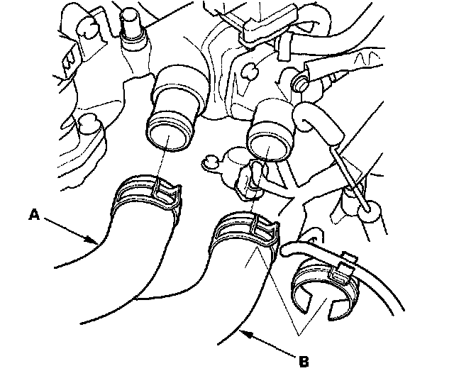 52. Remove the upper radiator hose (A) and lower radiator hose (B).
