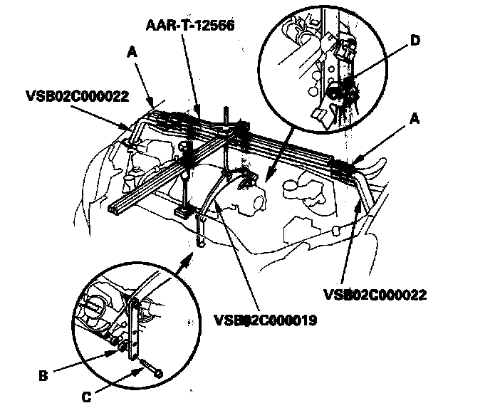 57. Install the engine hanger adapters (VSB02C000022) on the end of the engine support beams (A), then install the engine support hanger (AAR-T-12566) with the adapters to the vehicle.