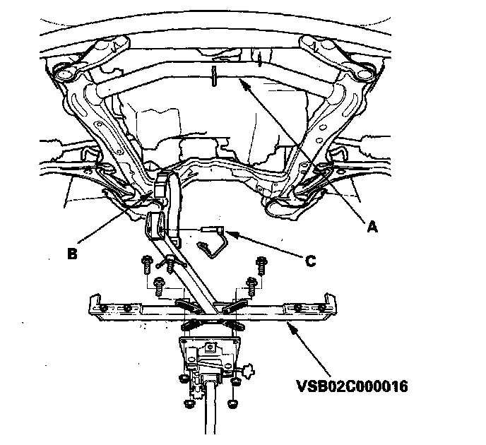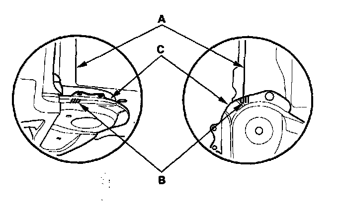 62. Make alignment marks (A) on the body across from the marks (B) on the edge of the front subframe (C).