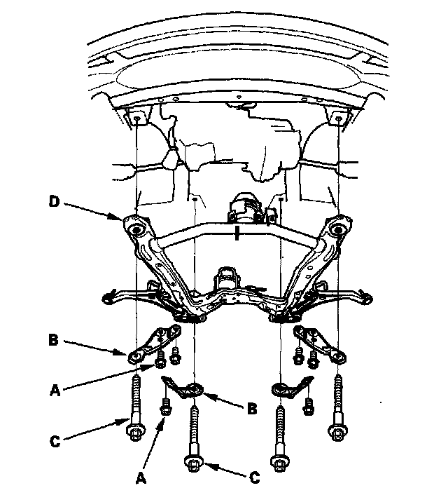 65. Remove the six 12 x 1.25 mm bolts (A) securing the subframe stiffeners (B), the four subframe mounting bolts (C), and the stiffeners, then lower the front subframe (D).