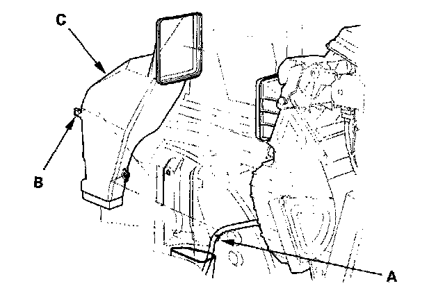 3. Remove the wire harness clip (A), the clip (B) and remove the side duct (C).