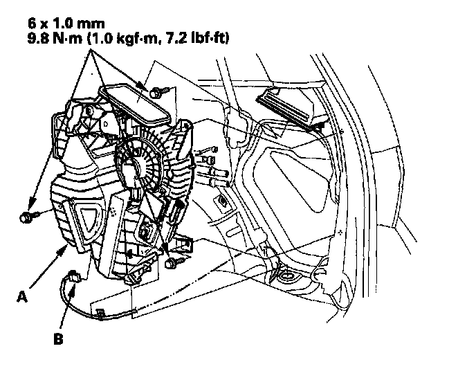 7. Remove the bolts, then pull out the rear HVAC unit (A). Disconnect the rear air mix control motor connector (B), then remove the rear HVAC unit.