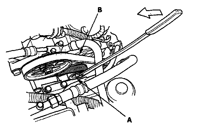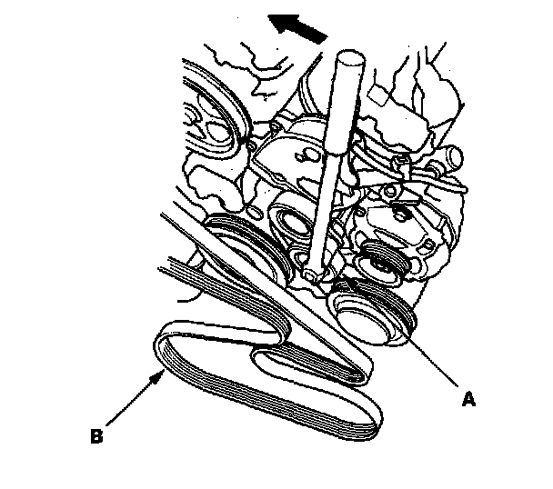 1. Move the auto-tensioner (A) to relieve tension from the drive belt (B), then remove the drive belt.
