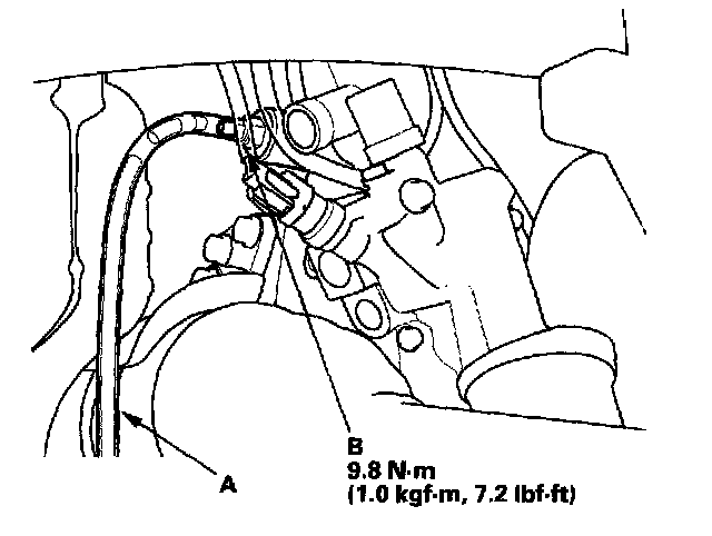 4. Install a rubber hose (A) on the drain bolt (B) located at the rear of the engine block, then loosen the drain bolt.