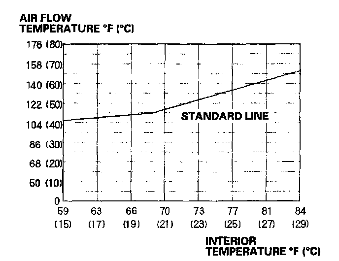 22. Set the climate control or heater control panel to maximum heat, and select high speed heat mode on the rear control panel. Measure the temperature of the air from the rear floor vent for 2 or 3 minutes. Make sure the temperature is above the standard line of the graph as shown. If the temperature is below the standard line, repeat steps 16 through 19 several more times. Then loosely install the radiator cap and recheck.