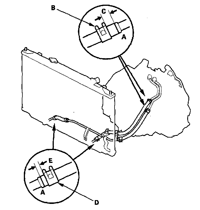 3. Secure the hoses at the ATF cooler with the clips (D) at 2 - 4 mm (0.1 - 0.2 inch) (E) from the hose ends.