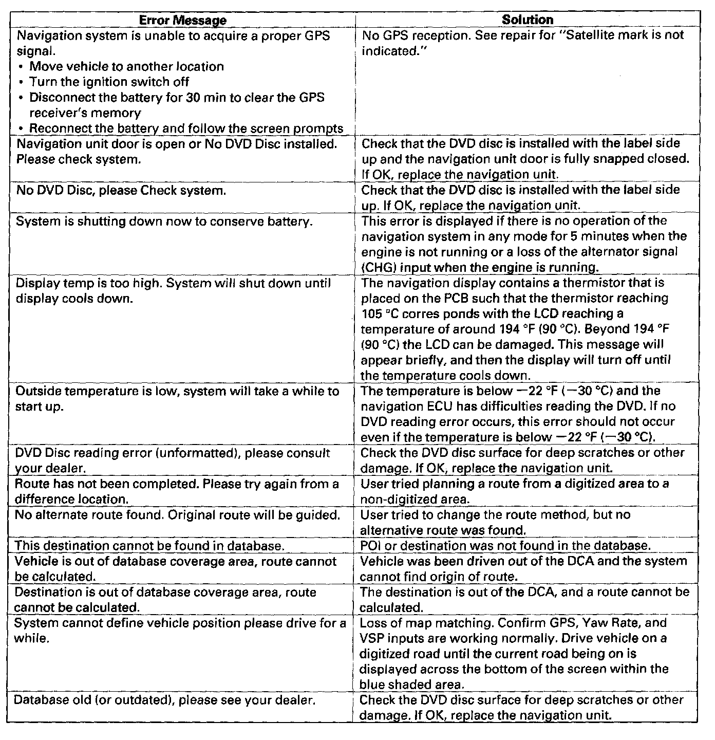Error Message Table: