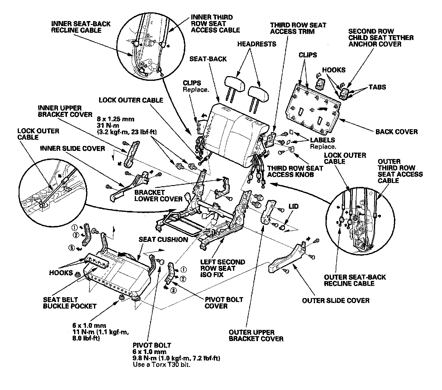 - Make sure the seat-back recline cables, third row seat access cables, and lock outer cable are connected securely.