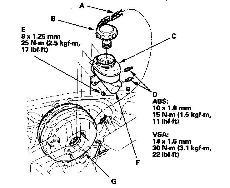 6. Remove the master cylinder (F) from the brake booster (G). Be careful not to bend or damage the brake lines when removing the master cylinder.