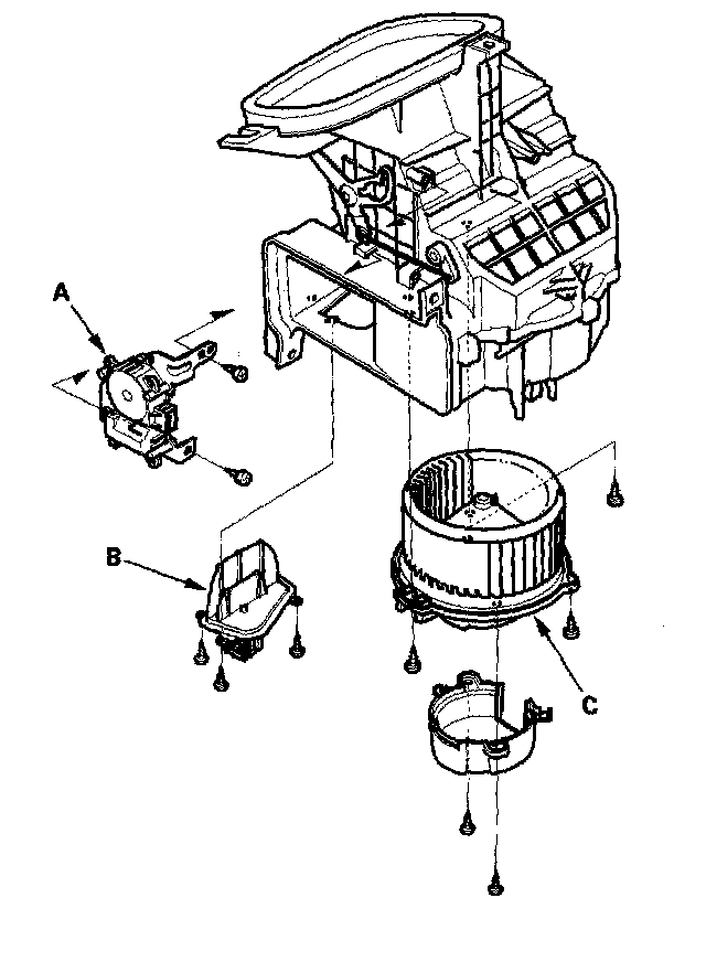 - The recirculation control motor (A), the power transistor (B), and the blower motor (C) can be replaced without removing the blower unit.
