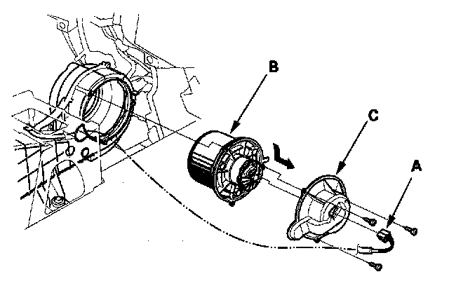 2. Disconnect the 2P connector (A) from the rear blower motor (B), then remove the self-tapping screws and the cover (C). Turn the rear blower motor clockwise to the stop, and remove it.