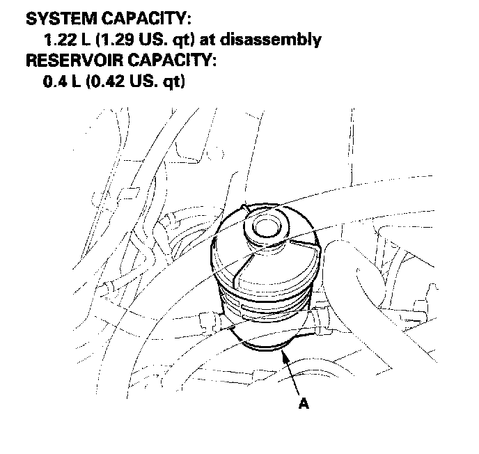 Fluid ReplacementCheck the reservoir (A) at regular intervals, and add the recommended fluid as necessary. Always use Honda Power Steering Fluid. Using any other type of power steering fluid or automatic transmission fluid can cause increased wear and poor steering in cold weather.